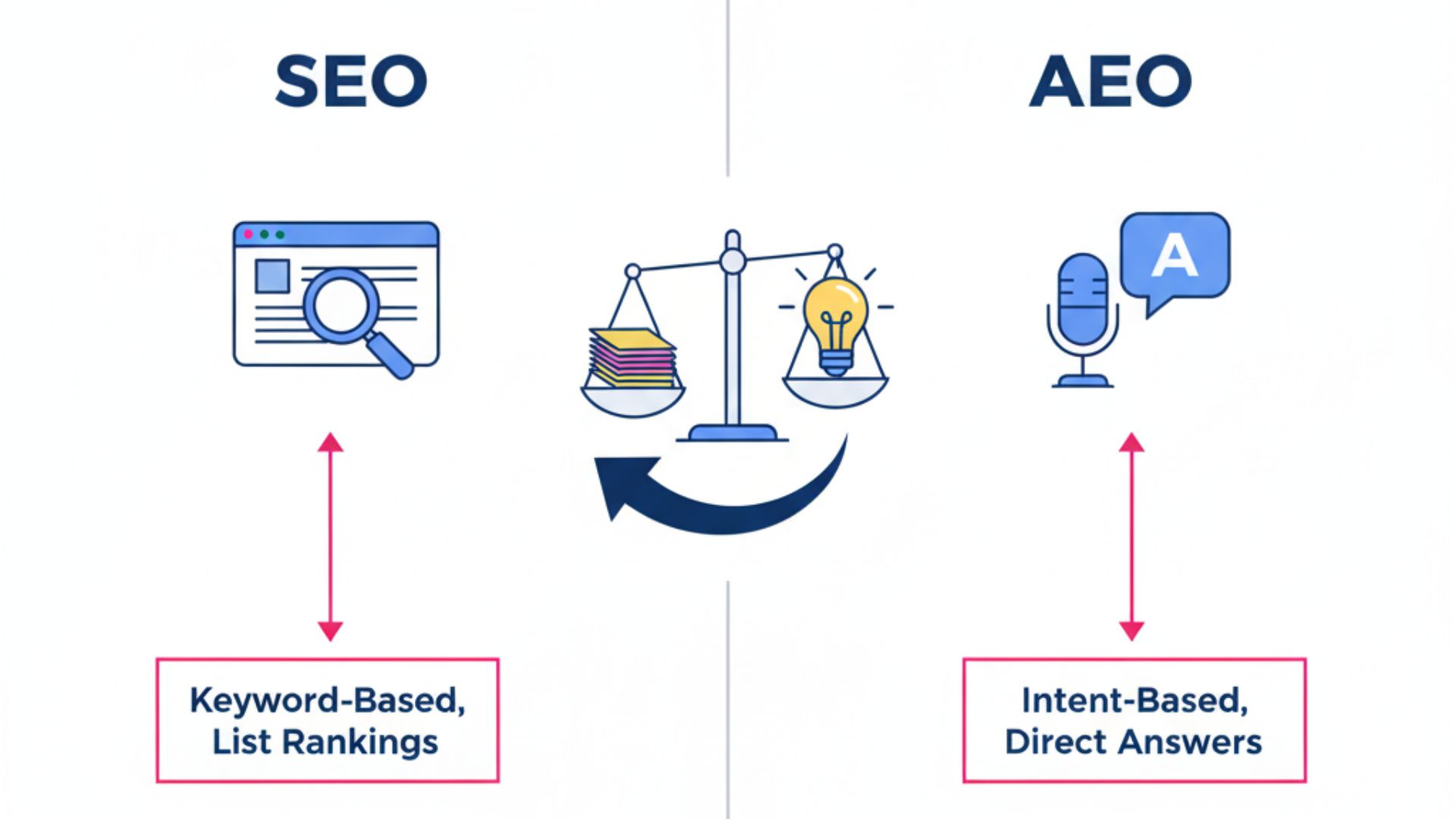 The core objective of SEO is to win a click, while the core objective of AEO is to win the answer. A high-ranking webpage in SEO may get a lot of traffic, but an AEO-optimized piece of content can be the one and only answer provided by a voice assistant, which offers an entirely different kind of visibility and brand authority.